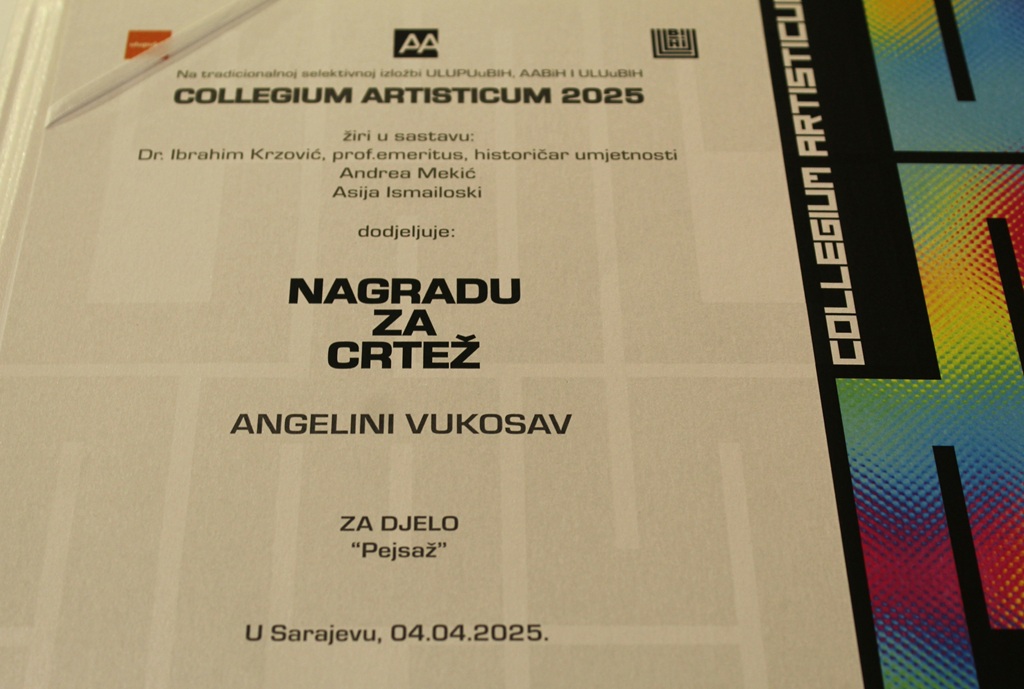 Da, nagrada „Collegium Artisticum 25“ bilo je drugo veliko iznenađenje za mene, druga velika nagrada. Dobila sam je na prestižnoj izložbi „Collegium Artisticum 2025“ u Sarajevu, u kategoriji crteža, kao osnovnoj oblasti likovne umjetnosti. Ovu nagradu dobila sam za djelo – crtež „Pejzaž“. Opčinjena sam našom prirodom, ona je moje nadahnuće i izvor stvaralaštva u likovnom radu. Naravno, iza ove nagrade stoji veliki rad, dok je samo djelo realizovano u ekspresiji i crtačkim tehnikama.