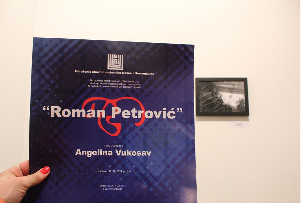 Da, kraj prošle godine je bio jako uspješan za mene. Pored uspješno realizovanih samostalnih izložbi, u Kragujevcu, Mostaru i Beogradu iznenadila me jedna divna nagrada, nagrada „Roman Petrović“ koju sam dobila u Sarajevu, u decembru prošle godine. Nagrada „Roman Petrović“ se dodjeljuje jednom godišnje na izložbi „Mali format.“ Ukazana mi je velika časti i povjerenje – jedan sam od najmlađih dobitnika i ove nagrade. Nagradu sam dobila za djelo – crtež „Pejzaž“.