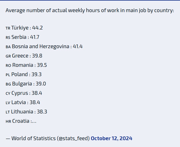 Prema podacima Eurostata na vrhu se trenutno nalazi Turska sa 44.2 radna sata sedmično, a odmah iza nje na drugom mjestu je Srbija sa 41.7 sati sedmično što je za 0.2 sati sedmično više nego što stoji u istraživanju „World Population Review„.