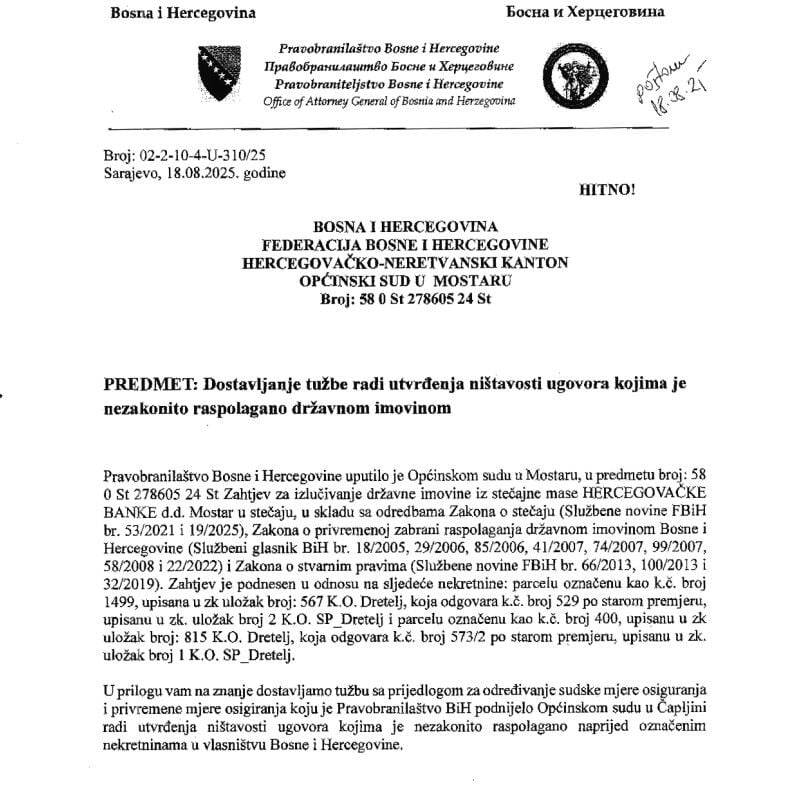 Pravobranilaštvo BiH ranije je uputilo Općinskom sudu u Mostaru zahtjev Pravobranilaštva BiH za izuzimanje državne imovine u postupku stečaja nad Hercegovačkom bankom i planiranom prodajom nekretnina Naftnih terminala u Dretelju.