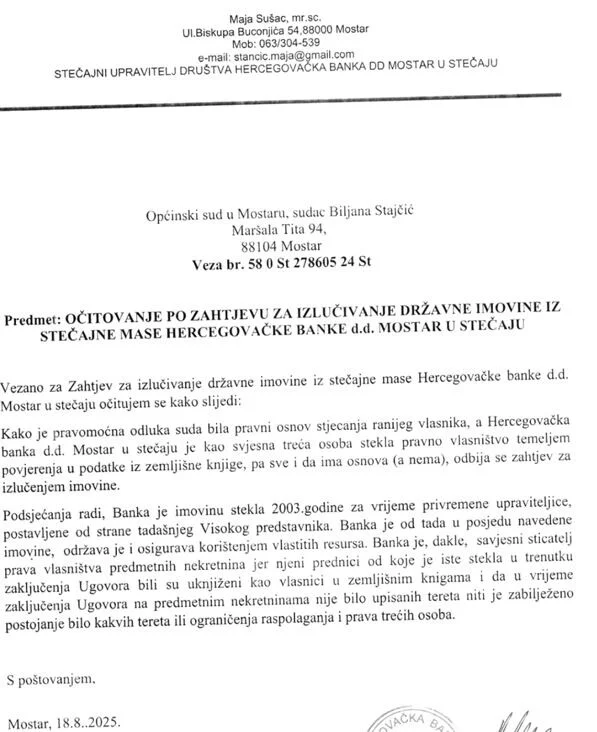Stečajna upravnica Maja Sušac očitovala se po zahtjevu za izlučenje državne imovine iz stečajne mase “Hercegovačke banke u stečaju” i kaže da je “Hercegovačka banka” imovinu “stekla 2003. godine za vrijeme privremene upraviteljice, postavljene od strane tadašnjeg visokog predstavnika”.