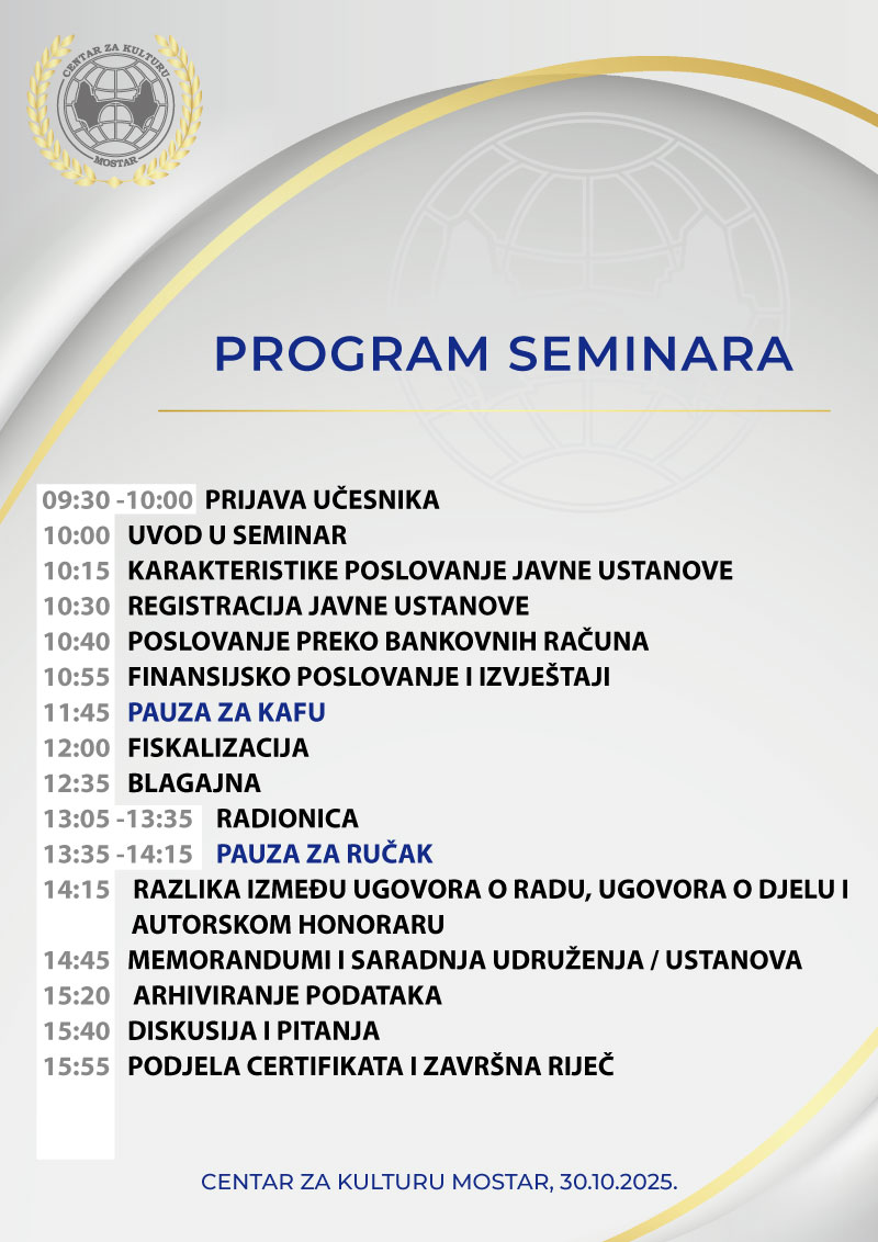 Edukativni seminar o finansijskom poslovanju i javnim nabavkama u kulturnim institucijama “Izazovi savremenog upravljanja” bit će upriličen u Centru za kulturu Mostar u četvrtak, 30. 10. 2025. godine u organizaciji ove javne ustanove uz podršku Odjela za društvene djelatnosti Grada Mostara.