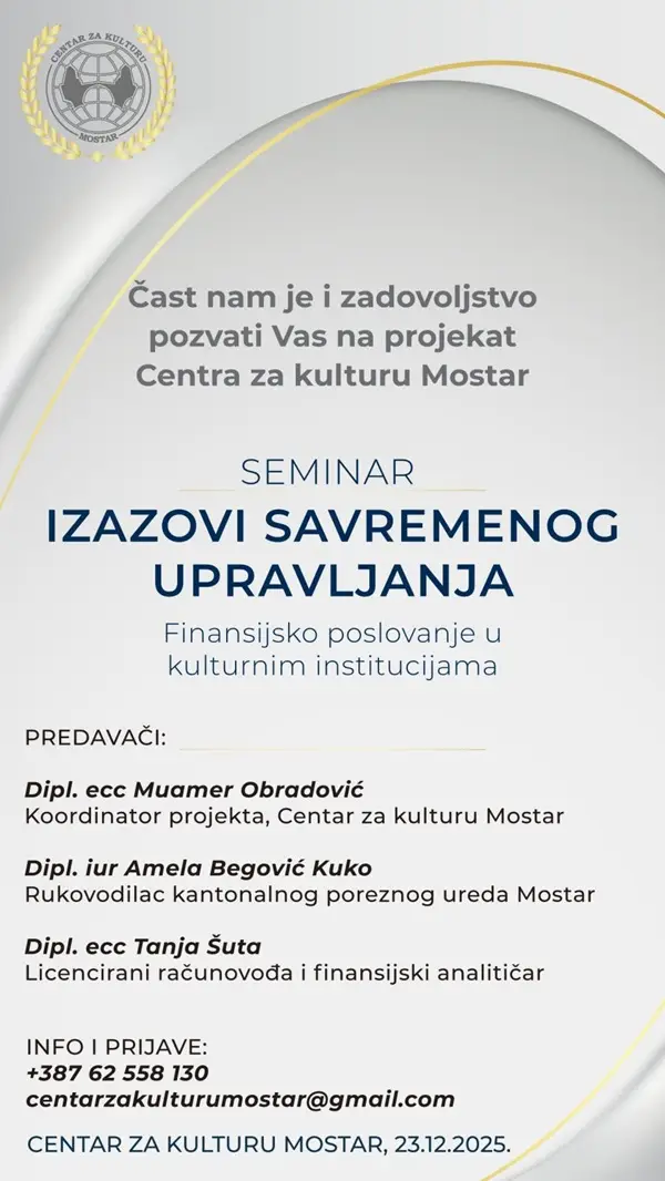 Edukativni seminar o finansijskom poslovanju i javnim nabavkama u kulturnim institucijama “Izazovi savremenog upravljanja” bit će upriličen u Centru za kulturu Mostar u utorak, 23. 12. 2025. godine u organizaciji ove javne ustanove uz podršku Odjela za društvene djelatnosti Grada Mostara.