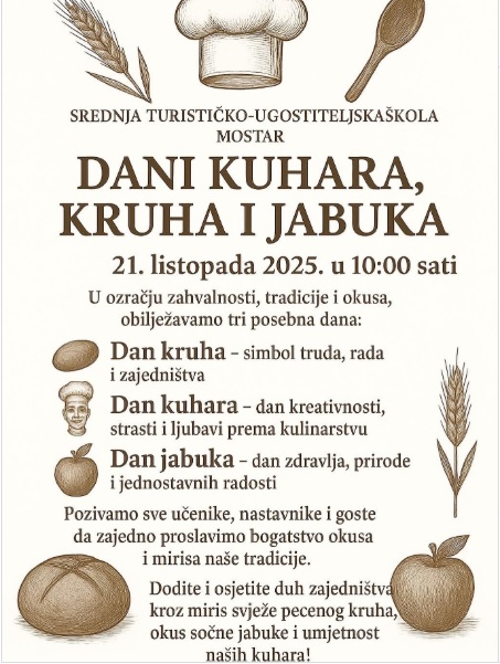 Učenici i profesori Srednje turističko-ugostiteljske škole Mostar danas će obilježiti “Dan kuhara, kruha i jabuka 2025.”, manifestaciju kojom će predstaviti spoj znanja, tradicije i domaćih okusa.