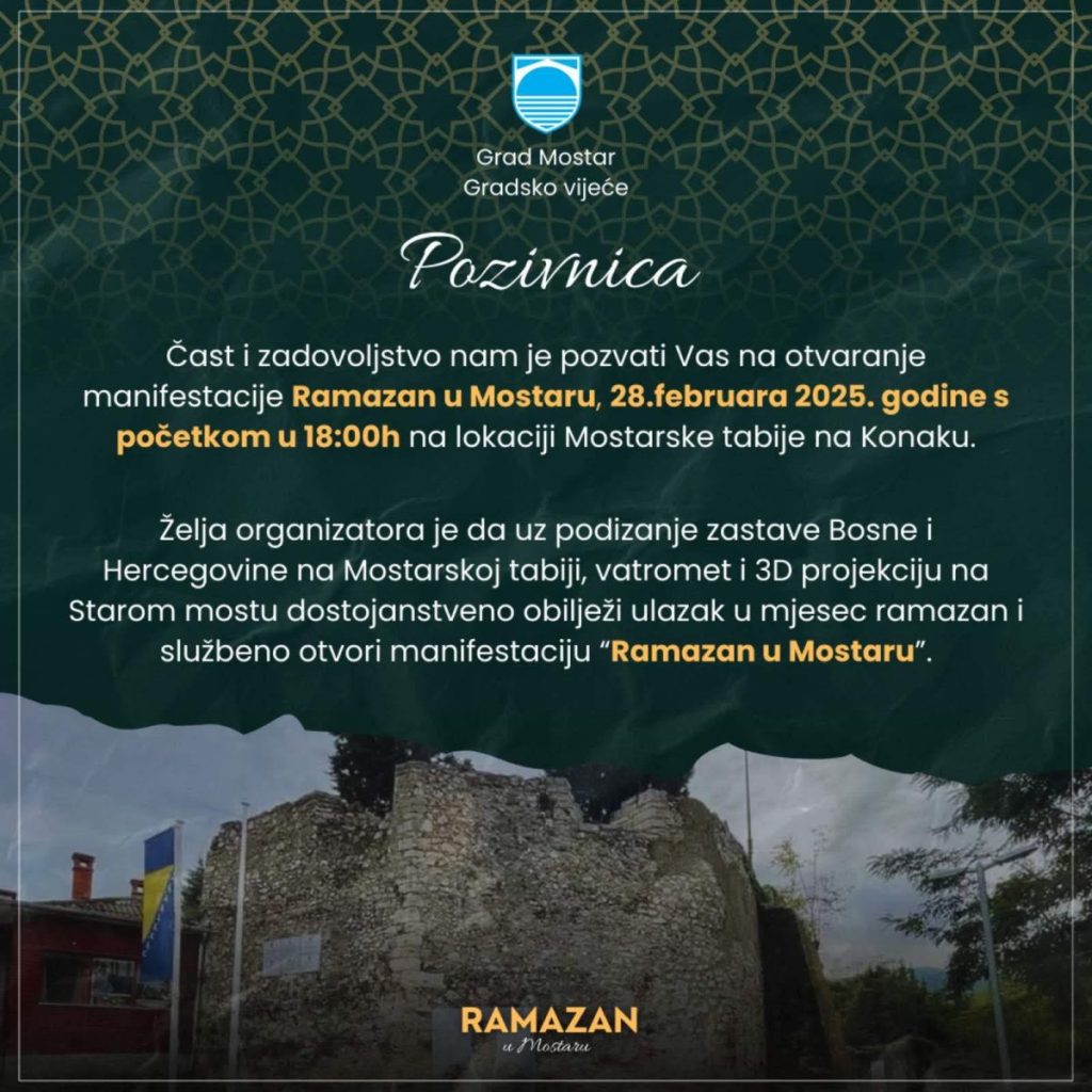 Danas u 12:00 sati, u sali Gradske vijećnice Grada Mostara, održat će se press konferencija na kojoj će biti najavljeni sadržaji ovogodišnje manifestacije „Ramazan u Mostaru“.