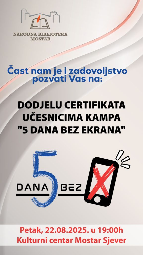 Dodjela certifikata učesnicima kampa ”5 dana bez ekrana”, u organizaciji Narodne biblioteke Mostar, bit će upriličena večeras u 19 sati u Kulturnom centru Mostar Sjever.