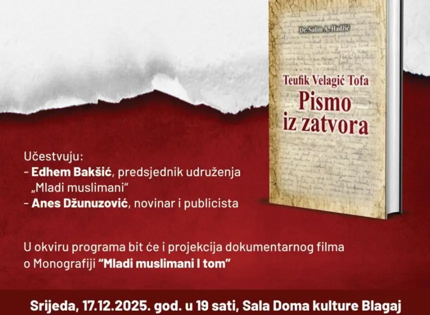 Promocijom knjige “Teufik Velagić Tofa- Pismo iz zatvora” autora Salima A. Hadžića, JU Dom kulture Blagaj u srijedu, 17. 12. u 19.00 sati obilježava 100 godina od rođenja Blagajca Teufika Velagića.