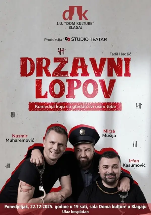 U Domu kulture Blagaj, uz podršku Programa za kulturu Grada Mostara, večeras u 19.00 sati bit će prikazana hit predstava “Državni lopov”.