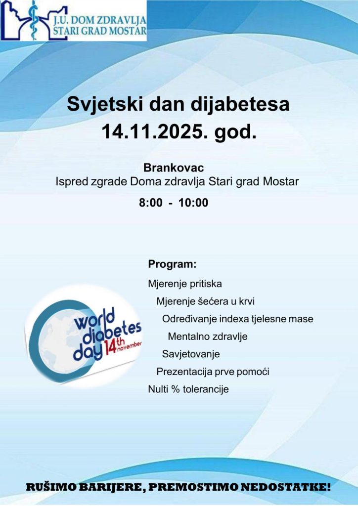 Dom zdravlja (DZ) Stari grad Mostar u petak 14. novembra 2025. godine obilježava Svjetski dan dijabetesa, besplatnim pregledima i savjetovanjima za građane.