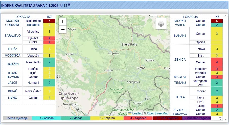Indeks kvalitete zraka (IKZ) iznosio je 5 što ga svrstava u kategoriju vrlo zagađen, objavljeno je na stranici Federalnog hidrometeorloškog zavoda BiH.