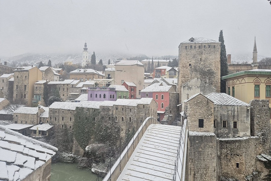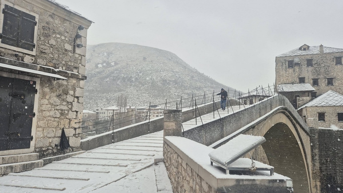 Snježni pokrivač jutros je dao poseban ugođaj Starom mostu i gradskim ulicama, pretvorivši grad na Neretvi u rijedak zimski prizor.