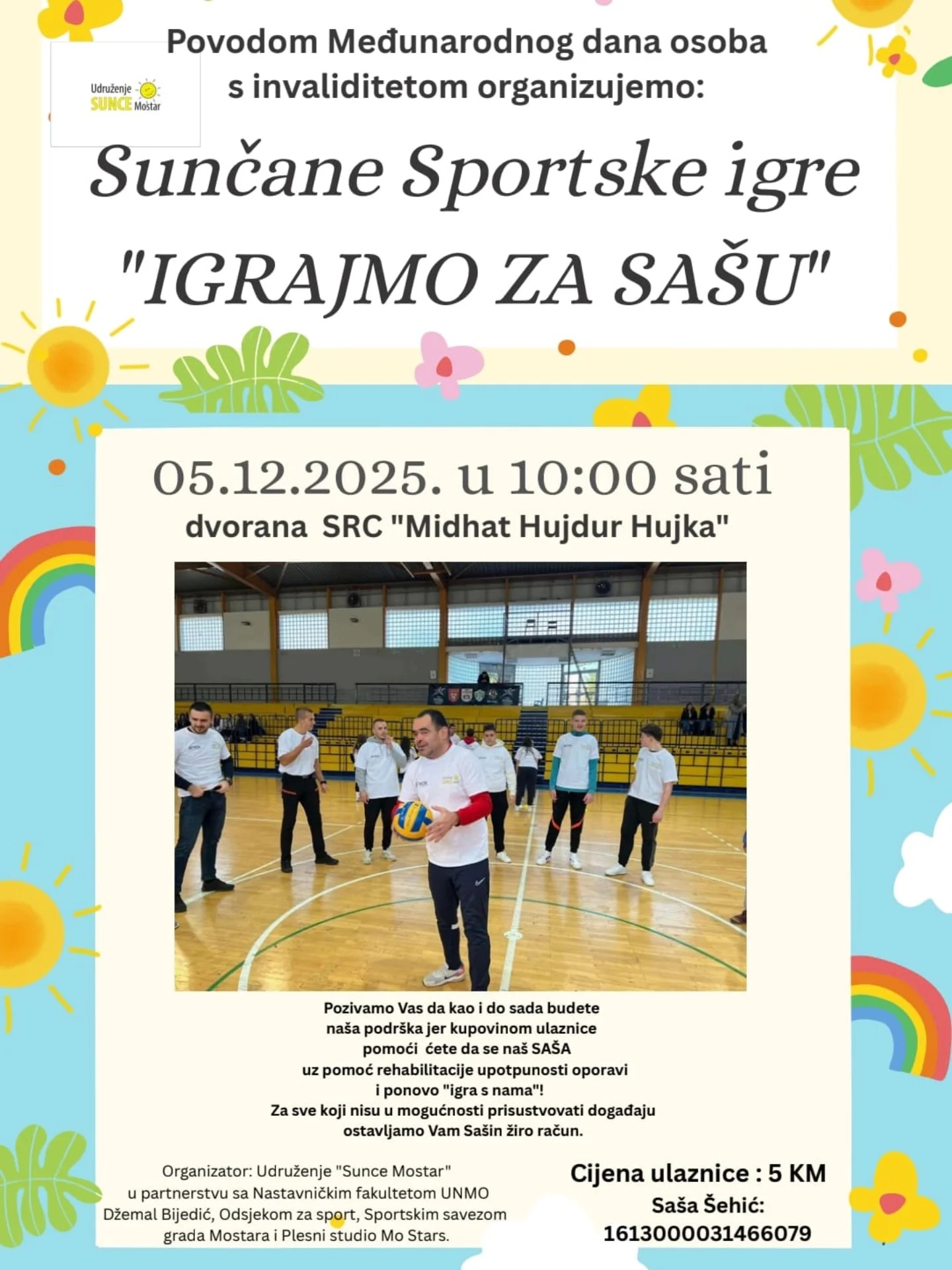 Povodom Međunarodnog dana osoba s invaliditetom, Udruženje “Sunce Mostar” u saradnji s Nastavničkim fakultetom Univerziteta “Džemal Bijedić” iz Mostara, Sportskim savezom (SS) Grada Mostara i Plesnim studiom Mo Stars organizuje humanitarne Sunčane sportske igre pod sloganom “Igrajmo za Sašu”.