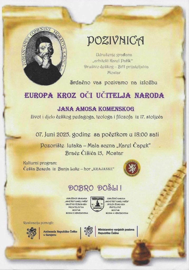 Kulturno-edukativni događaj pod nazivom „Evropa kroz oči učitelja naroda“, posvećen životu i djelu Jana Amosa Komenskog, velikana češke i evropske pedagoške misli, u organizaciji Udruženja “Arhitekt Karel Parik”, bit će upriličen večeras u 18 sati na Maloj sceni Pozorišta lutaka Mostar.