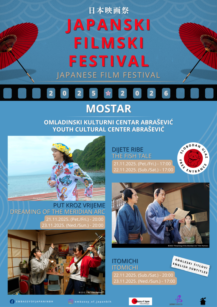 Japanski filmski festival održat će se od 21. do 23. novembra u Mostaru, u organizaciji Ambasade Japana u Bosni i Hercegovini i u saradnji s Japanskom fondacijom i OKC-om Abrašević. Festival je dio ciklusa koji će se održati u pet gradova BiH od novembra 2025. do februara 2026. godine.