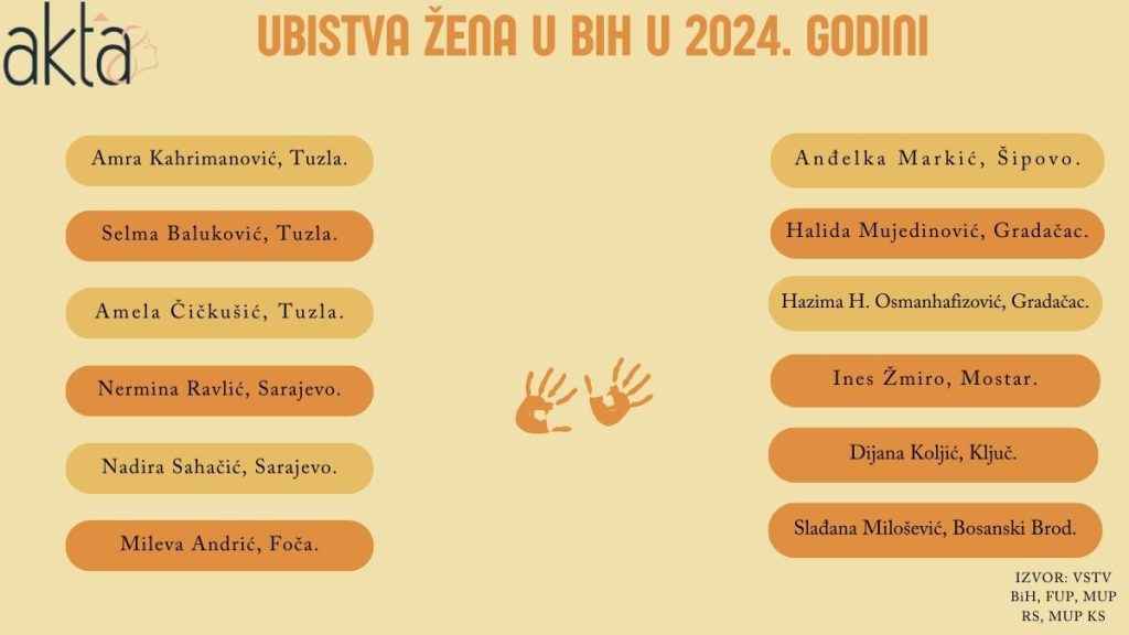 Prema istraživanju koje je sprovela Akta.ba, u 2024. godini zabilježeno je ukupno 12 žrtava femicida.