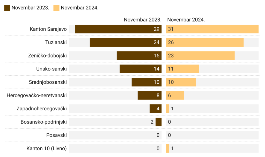Prema podacima Federalne uprave policije, najviše krivičnih djela zabilježeno je u vezi sa Nasiljem u porodici, i to 98, što predstavlja smanjenje od 16 posto u odnosu na novembar 2023. godine. Prijavljeno je 98 lica, među kojima je 45 povratnika u izvršenju krivičnih djela. Slobode je lišeno 57 lica.