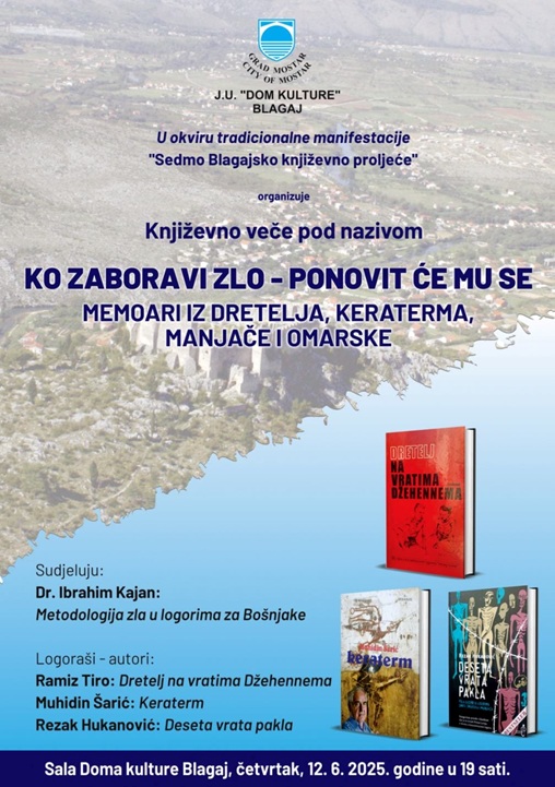 Književno veče pod nazivom “Ko zaboravi zlo, ponovit će mu se- Memoari iz Dretelja, Keraterma, Manjače i Omarske” održat će se večeras u 19.00 sati u Domu kulture Blagaj u okviru sedmog Blagajskog književnog proljeća.