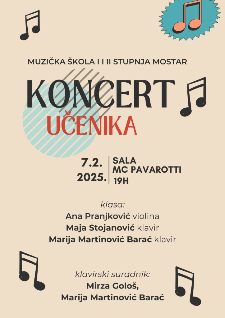 Učenici Muzičke škole I i II stupnja Mostar održat će u petak, 7. februara, koncert u koncertnoj sali Muzičkog centra Pavarotti u Mostaru.