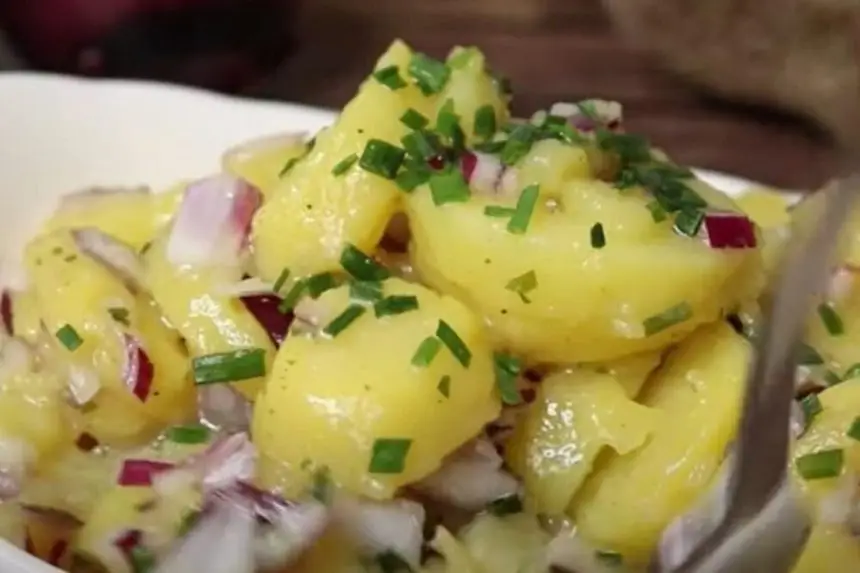 3. U toplu juhu dodajte senf, ocat, ulje, so i biber, sve dobro izmiješajte i prelijte preko krompira, lagano protresite zdjelu te ostavite salatu da odstoji najmanje sat vremena kako bi se sve arome upile.
