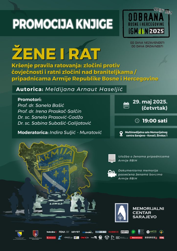 U okviru manifestacije „Odbrana Bosne i Hercegovine – Igman 2025 – od Dana nezavisnosti do Dana državnosti“, Memorijalni centar Sarajevo organizira promociju knjige – Žene i rat – Kršenje pravila ratovanja: zločini protiv čovječnosti i ratni zločini nad braniteljkama/pripadnicama Armije Republike Bosne i Hercegovine – autorice dr. Meldijane Arnaut-Haseljić, naučne saradnice Instituta za istraživanje zločina protiv čovječnosti i međunarodnog prava Univerziteta u Sarajevu te predsjednice Udruženja pripadnica Armije RBiH.