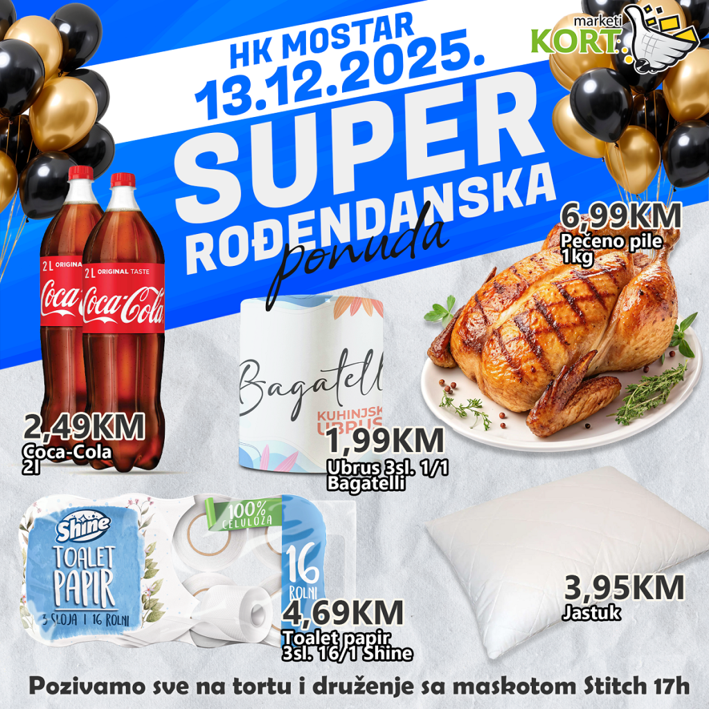 Najmlađe posjetioce očekuje druženje sa maskotom Stitch od 17 sati i rođendanska torta, a za sve posjetioce će biti degustacije i odlična akcija u Hiper Kortu Mostar.