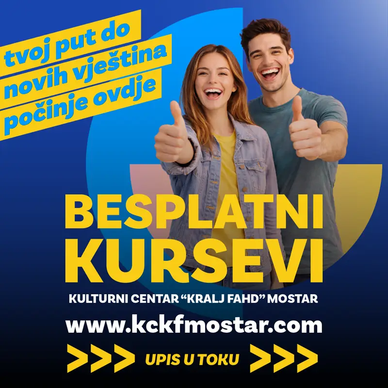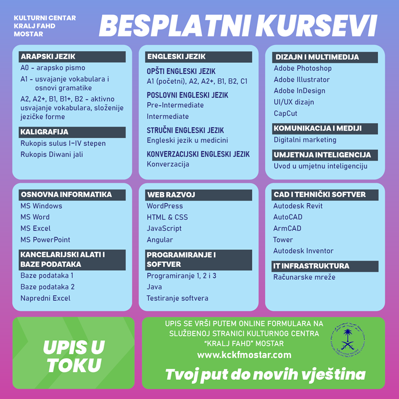 Kulturni centar “Kralj Fahd” Mostar otvorio je upis na besplatne kurseve iz oblasti informatike, engleskog i arapskog jezika, kao i kaligrafije.