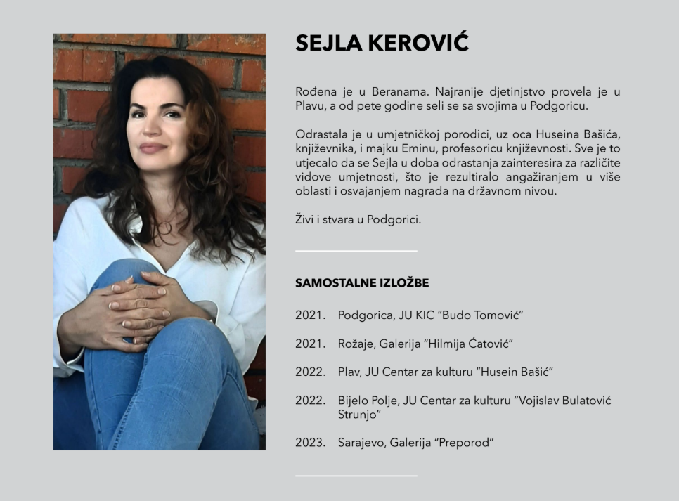 Sejla Kerović rođena je 1973. godine u Beranama, odrasla u Podgorici u umjetničkoj porodici, a njen slikarski rukopis oblikovan je senzibilitetom koji spaja duhovnu introspekciju i metafizičku imaginaciju, uz likovne elemente neoromantizma, ekspresionizma i simbolizma.