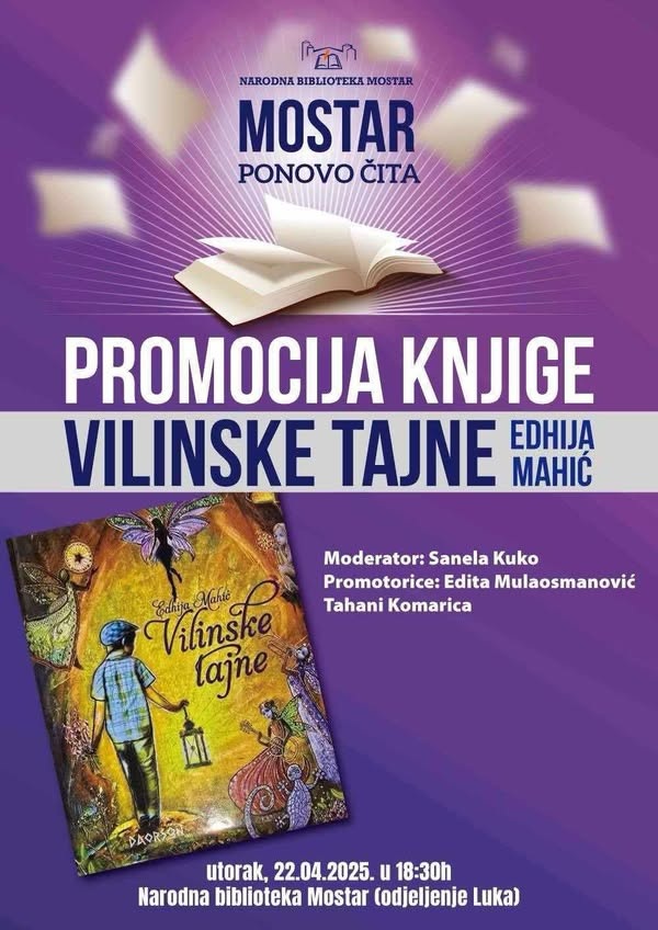 Promocija knjige “Vilinske tajne” autorice Edhije Mahić, bit će upriličena u Narodnoj biblioteci Mostar večeras u 18.30 sati u okviru manifestacije “Mostar ponovo čita” koju organizuje Narodna biblioteka.