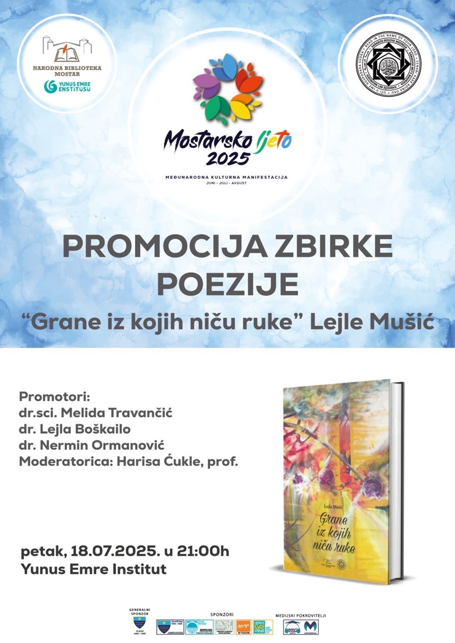 Promocija zbirke poezije “Grane iz kojih niču ruke” autorice Lejle Mušić bit će upriličeno u Institutu Yunus Emre Mostar u petak, 18.7. 2025. godine u 21.00 sat u sklopu kulturne manifestacije “Mostarsko ljeto 2025”.