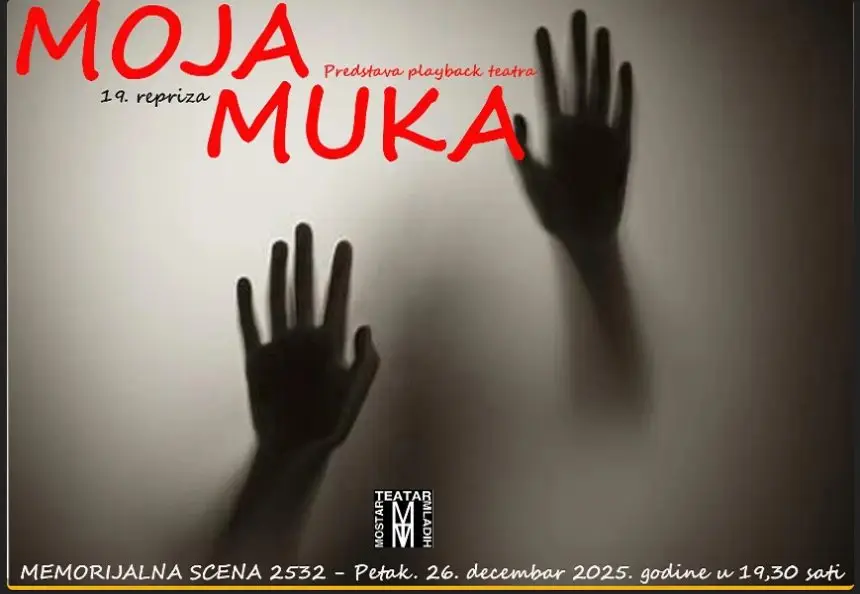 Mostarski teatar mladih (MTM) večeras u 19:30 sati na Memorijalnoj sceni 2532 prikazuje playback predstavu "Moja muka". Ovo je devetnaesta izvedba predstave koja u potpunosti uključuje publiku, ona je ujedno i scenarist.