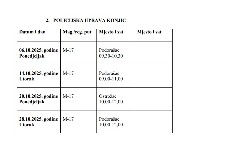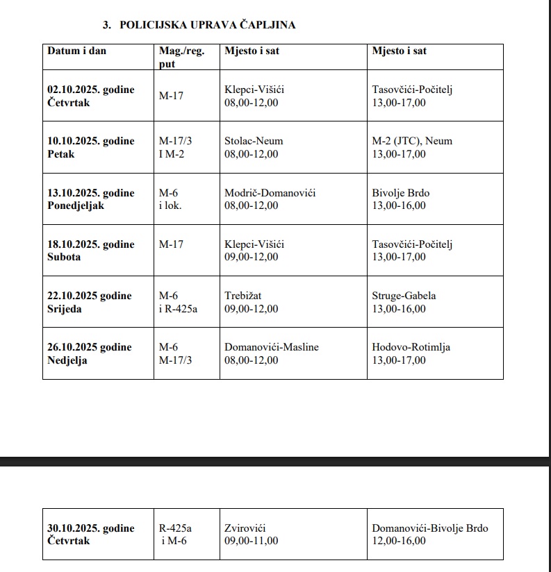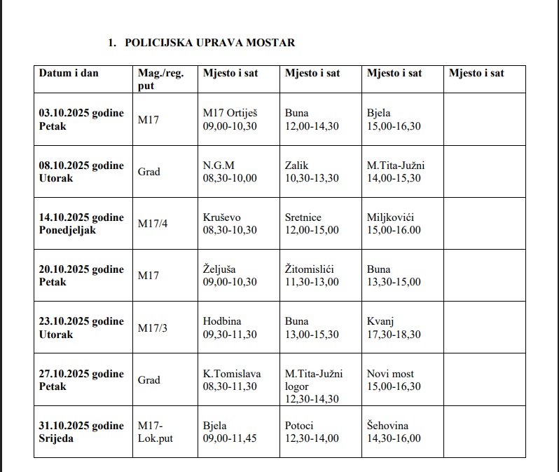 Ministarstvo unutrašnjih poslova (MUP) Hercegovačko-neretvanskog kantona (HNK) objavilo je plan radarskih kontrola za mjesec oktobar 2025. godine.