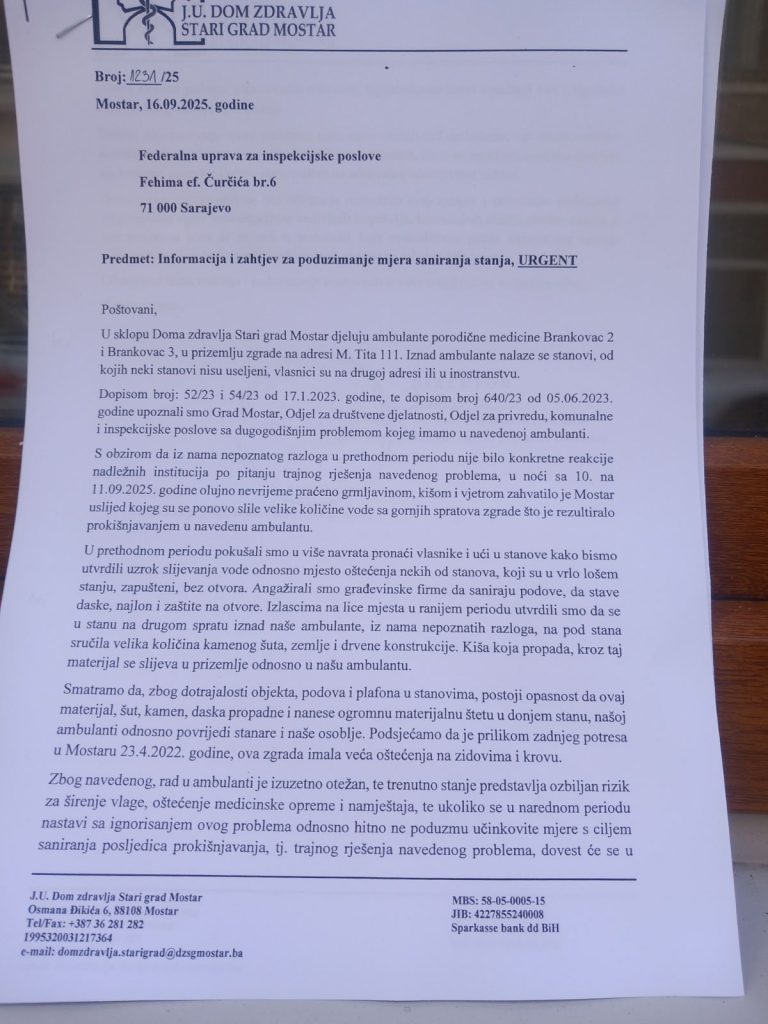 Tako se Dom zdravlja Stari Grad Mostar u dva navrata obraćao Federalnoj upravi za inspekcijske poslove, prvi put 2023. godine, i drugi put u septembru 2025. godine.