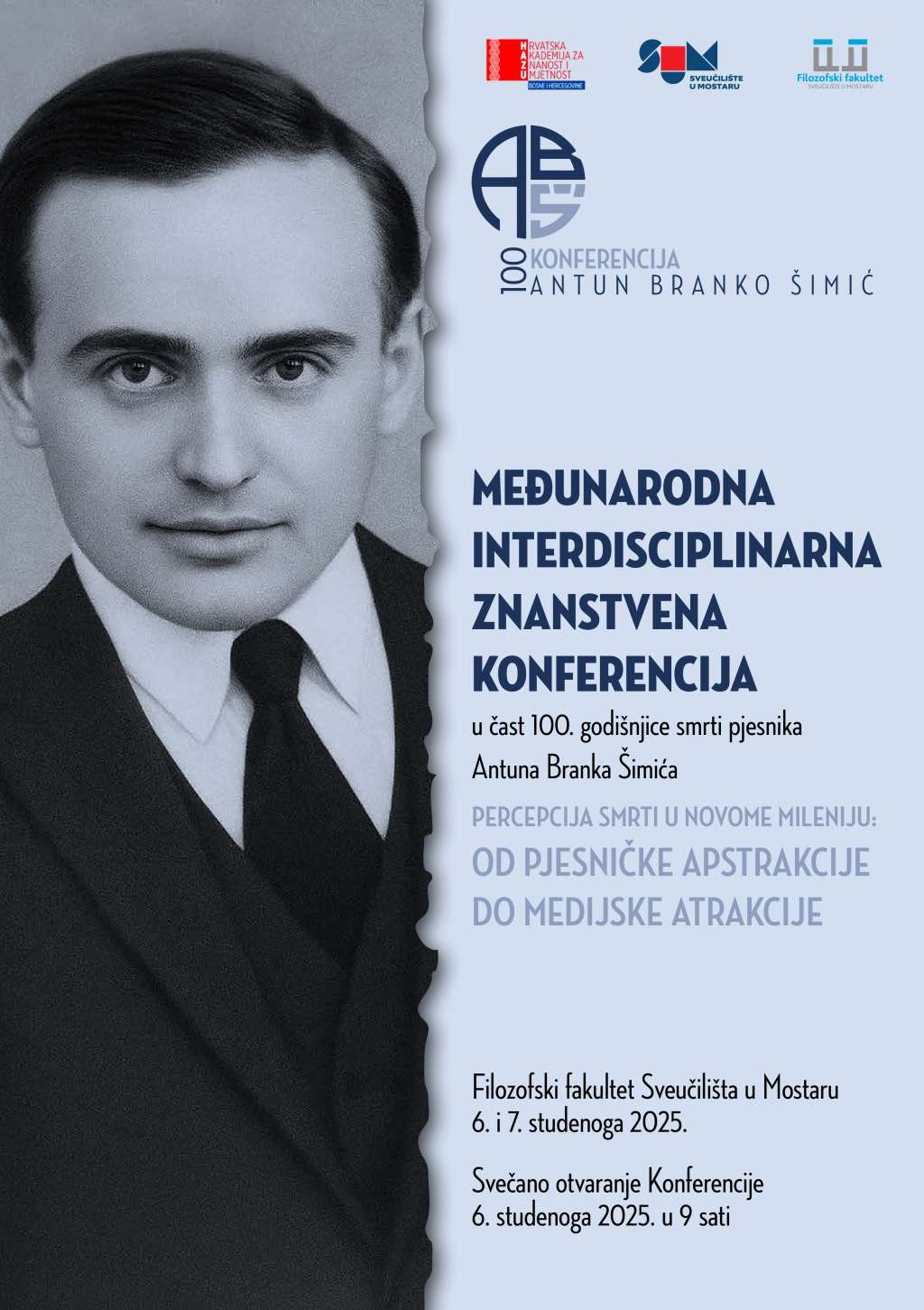 Međunarodna interdisciplinarna naučna konferencija u povodu 100. godišnjice smrti Antuna Branka Šimića održat će se 6. i 7. novembra na Filozofskom fakultetu Sveučilišta u Mostaru (SUM) na temu “Percepcija smrti u novom mileniju: Od pjesničke apstrakcije do medijske atrakcije”.