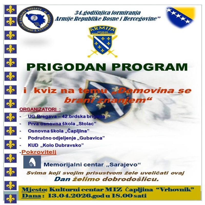 Obilježavanje 34. godišnjice formiranja Armije Republike Bosne i Hercegovine održat će se večeras u 18.oo sati u sali kulturnog centra Medžlisa Islamske Zajednice na Vrhovniku u organizaciji UG “Bregava-42. brdska brigada, Prva osnovna škola “Stolac”, Osnovna škola “Čapljina”, Područno odjeljenje “Gubavica”, KUD “Dubravsko kolo”.