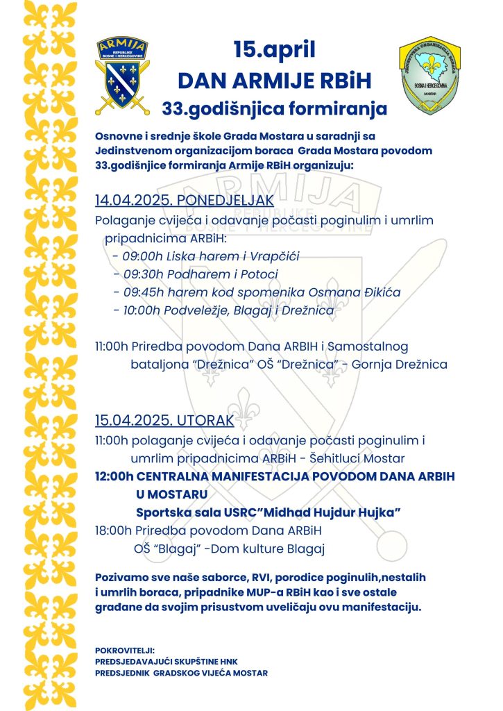 Podsjetimo, Jedinstvena organizacija boraca (JOB) Grada Mostara i osnovne i srednje škole u Mostaru koje nastavu izvode po bosanskom planu i programu organizatori su manifestacije obilježavanja Dana Armije RBiH.