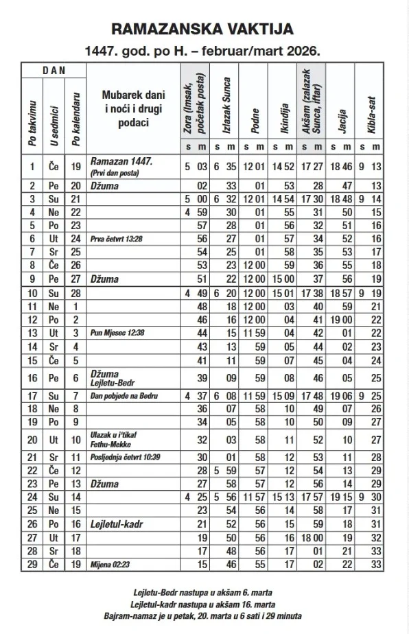 Objavljena je ramazanska vaktija za 2026. godinu, koja precizno određuje raspored posta, molitvi i najvažnijih vjerskih datuma tokom mjeseca ramazana.