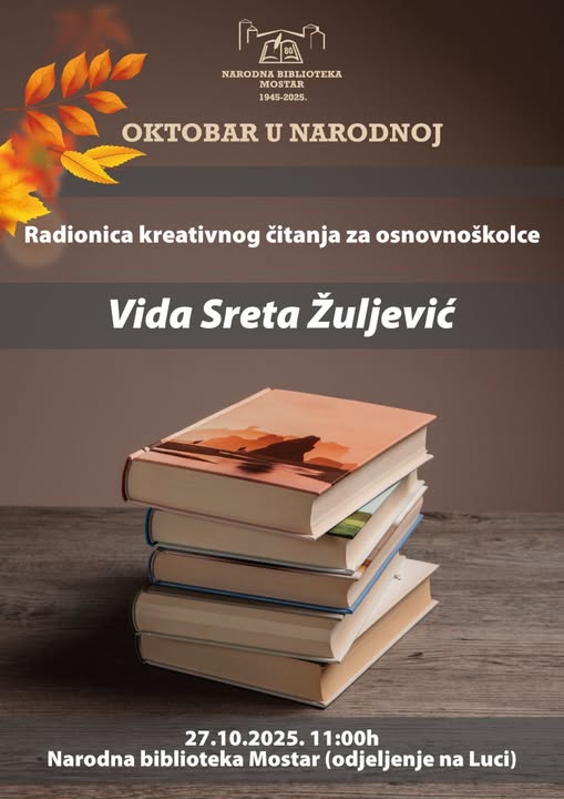 U okviru manifestacije “Oktobar u Narodnoj” koju povodom mjeseca knjige organizuje Narodna biblioteka Mostar, u ponedjeljak 27. 10. 2025. godine, bit će upriličena radionica kreativnog čitanja za učenike petih razreda osnovne škole sa Bakom pričalicom, Vidom Sretom Žuljević.