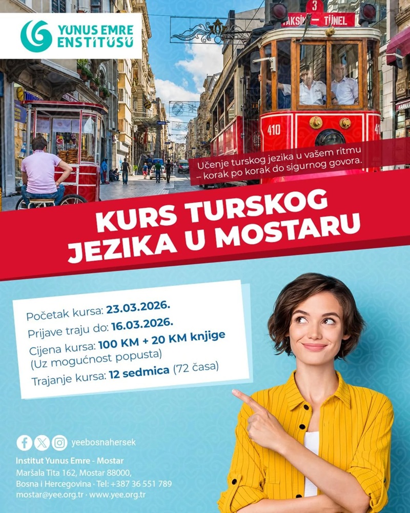“Prijave za kurs turskog jezika u Institutu Yunus Emre Mostar su otvorene do 16.03.2026., a vrše se lično u prostorijama Instituta.