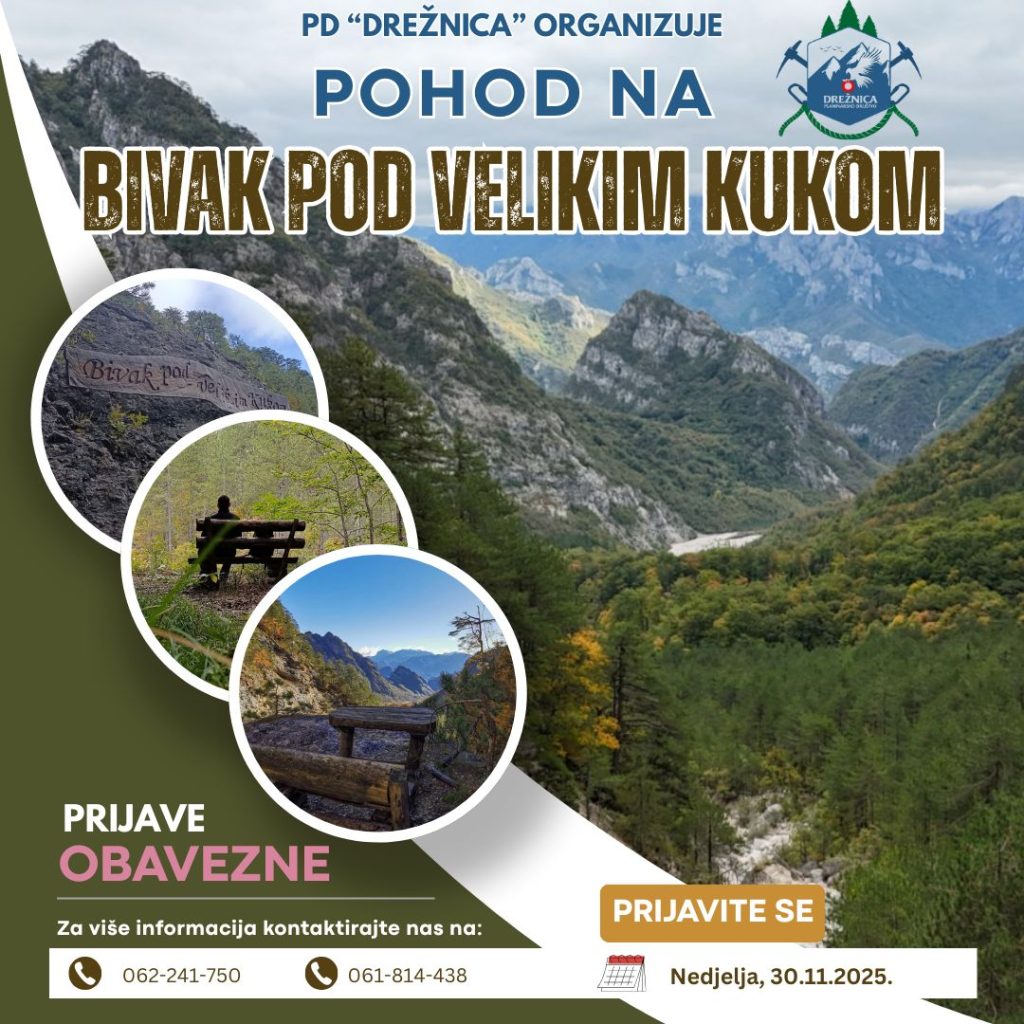 Planinarsko društvo (PD) Drežnica u saradnji sa Omladinskim savezom Bijelo Polje, u nedjelju 30. 11. 2025. godine, za članove društva, planinare i ljubitelje prirode organizuje izlet do bivka “Žiško”, koji se nalazi pod stijenom Velikog Kuka na Čvrsnici.