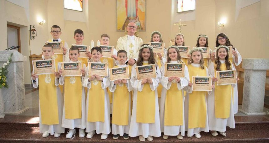 Petnaest Prvopričesnika, obučenih u svečano jednako prvopričesničko ruho, u procesiju su ušli u crkvu. Sv. Misu je predvodio bjelopoljski župnik don Rajko.
