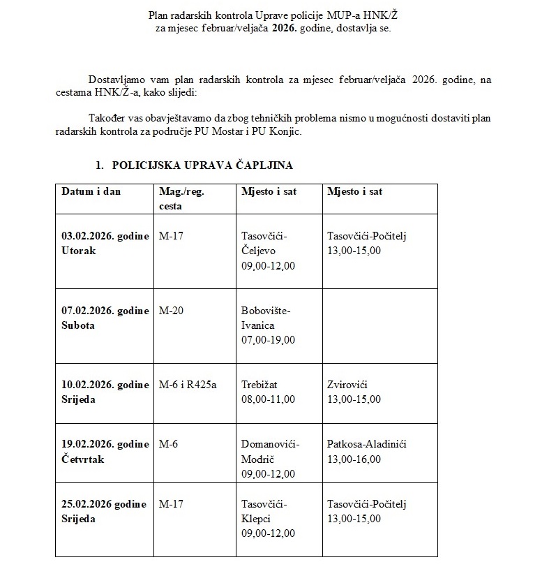 Ministarstvo unutrašnjih poslova (MUP) Hercegovačko -neretvanskog kantona (HNK) objavilo je plan radarskih kontrola za mjesec februar.