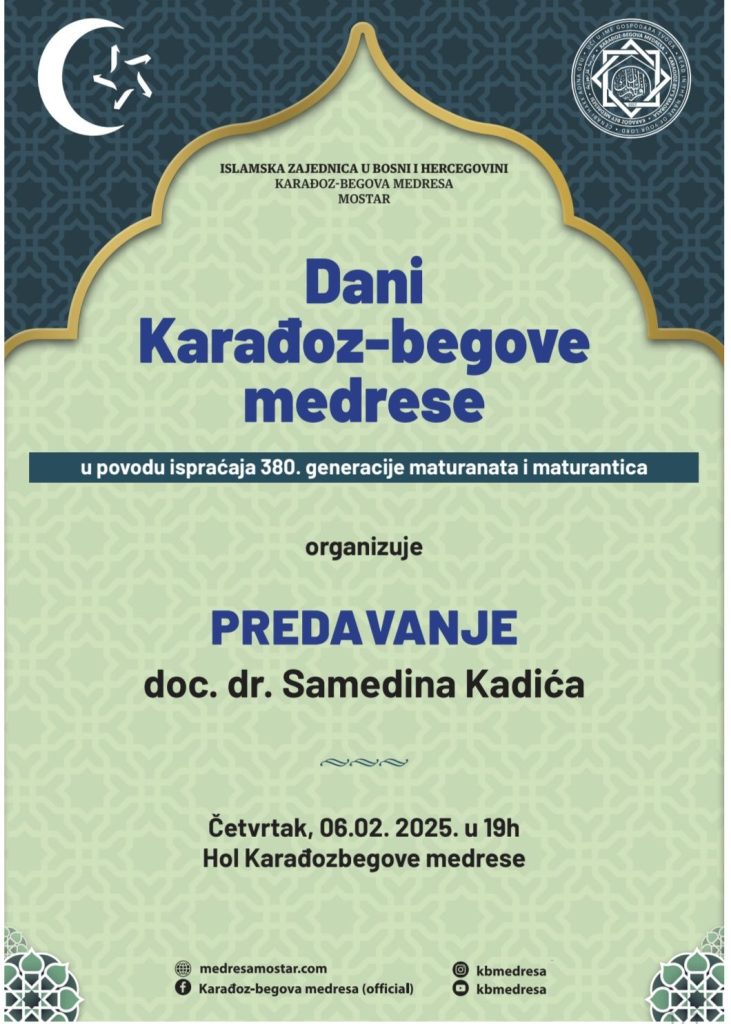 Prvi sadržaj ovogodišnje manifestacije, kojim će i zvanično biti otvorena, jeste predavanje doc. dr. Samedina Kadića, koje će se održati u atriju Medrese.