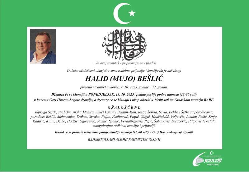 Dženaza-namaz Halidu Bešliću bit će klanjana u ponedjeljak, 13. oktobra, poslije podne namaza (u 13.30 sati) u haremu Gazi Husrev-begove džamije u Sarajevu, a ukop će biti obavljen u 15.00 sati na Gradskom mezarju Bare.