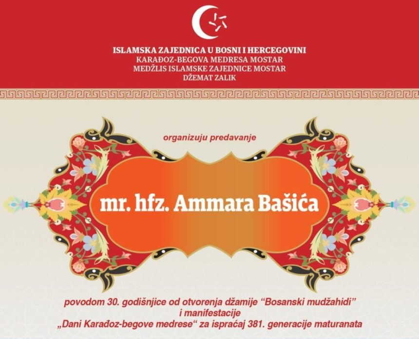 Predavanje mr. hfz. Ammara Bašića bit će održano u utorak, 10. februara 2026. godine, nakon jacija-namaza, u džamiji „Bosanski mudžahidi“, u sklopu manifestacije „Dani Karađoz-begove medrese“, saopćeno je iz ove odgojno-obrazovne ustanove.