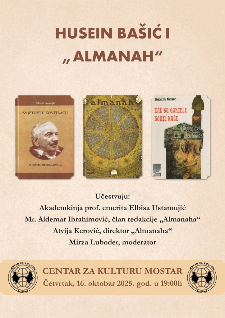 U četvrtak, 16. oktobra 2025. godine, s početkom u 19 sati, u Centru za kulturu Mostar biće održan značajan kulturni program pod nazivom “Husein Bašić i Almanah”.