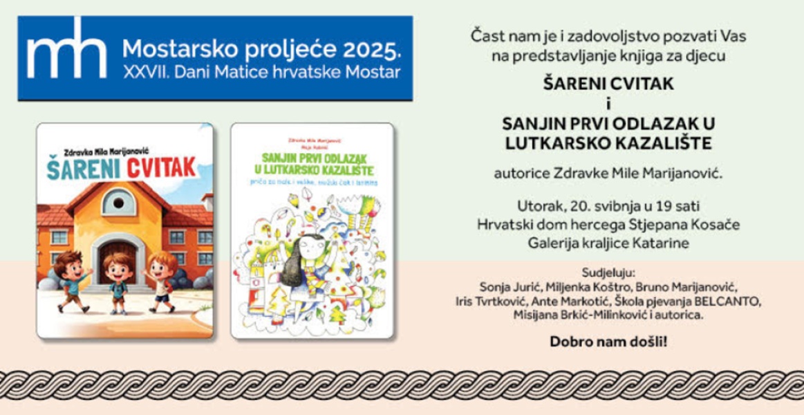 U okviru književnog programa manifestacije Mostarsko proljeće 2025. – XXVII Dani Matice hrvatske Mostar, večeras u 19.00 sati, u Galeriji kraljice Katarine Kosače u Mostaru bit će upriličeno predstavljanje dviju knjiga za djecu autorice Zdravke Mile Marijanović – zbirke pjesama ”Šareni cvitak” i slikovnice ”Sanjin prvi odlazak u Lutkarsko kazalište”.