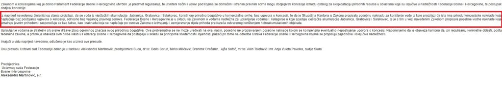 „Utvrđuje se da član 74. Zakona o vodama Hercegovačko-neretvanskog kantona nije u skladu sa Ustavom Federacije Bosne i Hercegovine“, stoji u presudi Ustavnog suda FBiH.