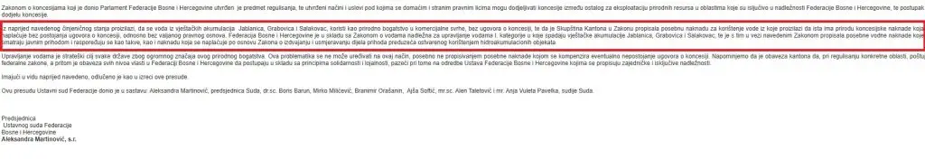 Sud naglašava da je Zakonom o koncesijama koji je donio Parlament Federacije Bosne i Hercegovine utvrđen predmet regulisanja, te načini i uslovi pod kojima se domaćim i stranim pravnim licima mogu dodjeljivati koncesije za eksploataciju prirodnih resursa u oblastima koje su isključivo u nadležnosti Federacije.