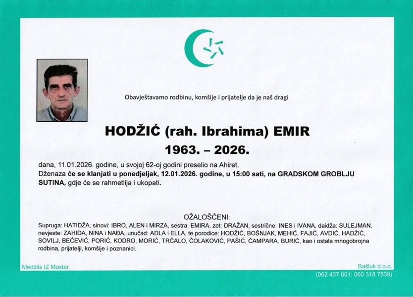Dženaza namaz obavit će se u ponedjeljak, 12. 1. u 15.00 sati na Gradskom groblju Sutina.