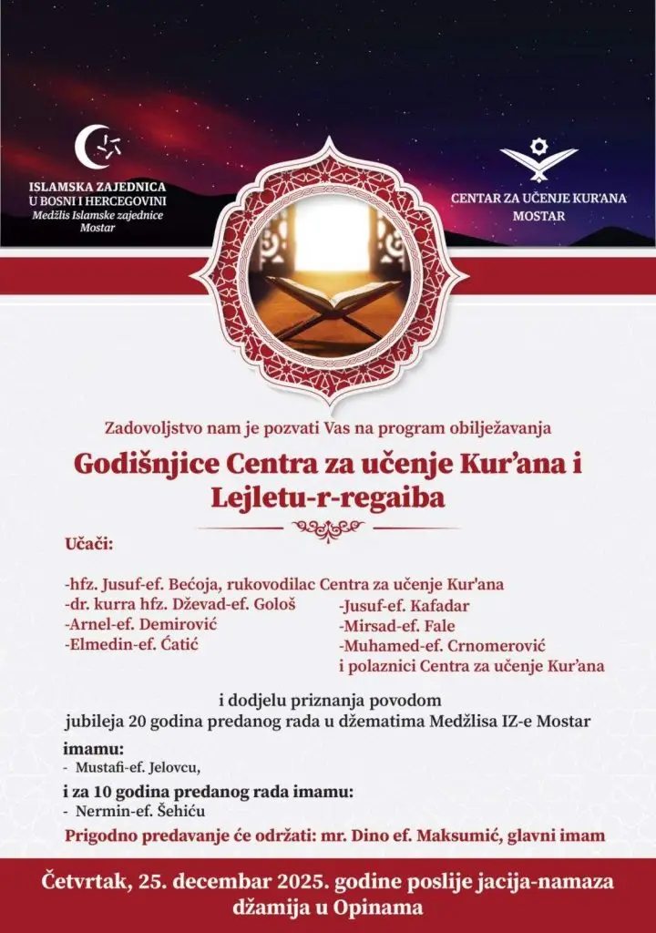 Program obilježavanja mubarek večeri Lejletur-regaiba i godišnjice Centra za učenje Kur’ana Medžlis Islamske zajednice Mostar organizirat će u džamiji u Opinama, u četvrtak, 25. decembra 2025. godine, poslije jacija-namaza.